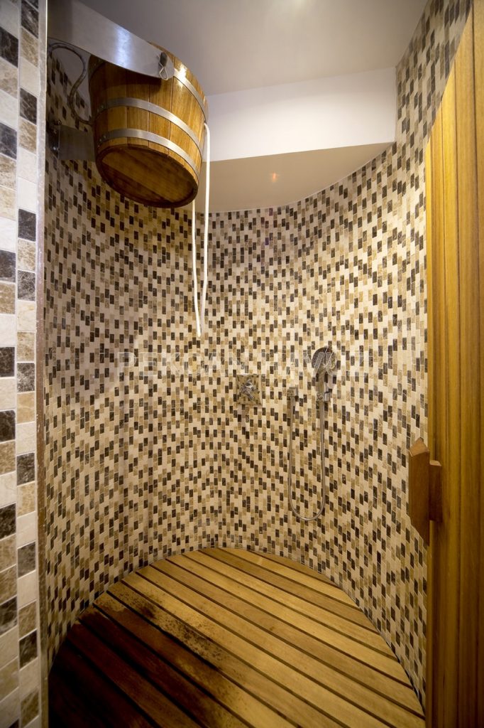 Hot spa units such as Sauna, steam room and shock shower system applied to restore the body’s resurrection after therapy applications. It can also be considered as an alternative for those who want to use a shock pool or a shock shower. The bucket shower is made entirely of Kambala wood and is a design based entirely on handwork. The volume of the large bucket is about 29 litres. The filling amount can be adjusted between 5 and 15 liters. The full bucket shower that hangs on the wall is emptied by pulling with the help of ropes. The user who enters the bucket shower for the first time feels as if he or she has gone under the waterfall. Shock the natural shock effect is achieved by the effect of the cold water in the shower bucket.